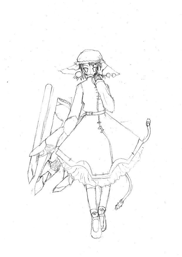八雲一家最後の一人、藍の嫁こと橙です。なんかアタマの中のイメージより右手がグロテスクになってしまいました。本当はもう少し機械的で、主人公(橙は主人公ではないと思いますが)らしい右手になるハズだったのですけど、どこかで狂ってしましました。トリプルパイルバンカー+ブースター兼分離兵器×2・・というアイディアの段階で可笑しかったのかも。しかしゴツくてデカい右手という当初の考えは形になりました。