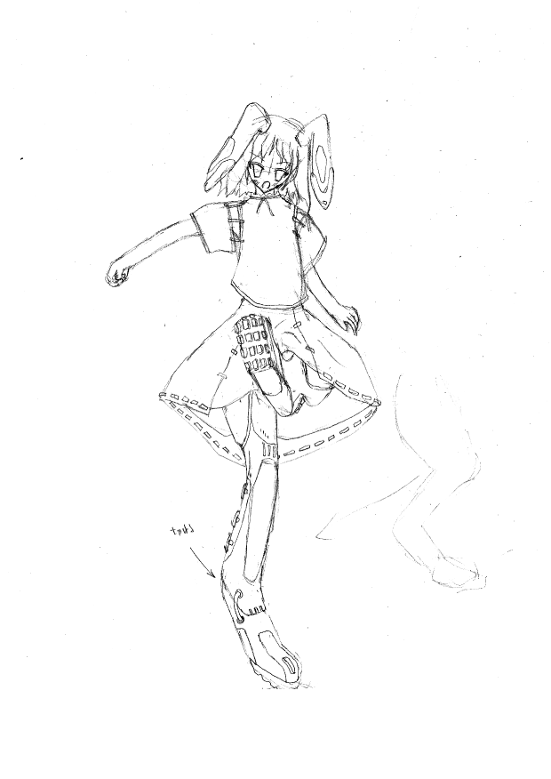 蓬莱組は進んだ技術を持っているってことで、生体融合型なイメージで作ってます。橙と同じイメージ(橙は気持ち悪くなりすぎですが)で描きました。膝と腿の外側に格納スペース、足はチューブの部分で分離、ふくらはぎの三連ブースター等、技術の結晶なニーソもどきになってます。当然身長が高くなってます。本物の足はチューブの部分までしかないので。逆間接はロマンですよ。